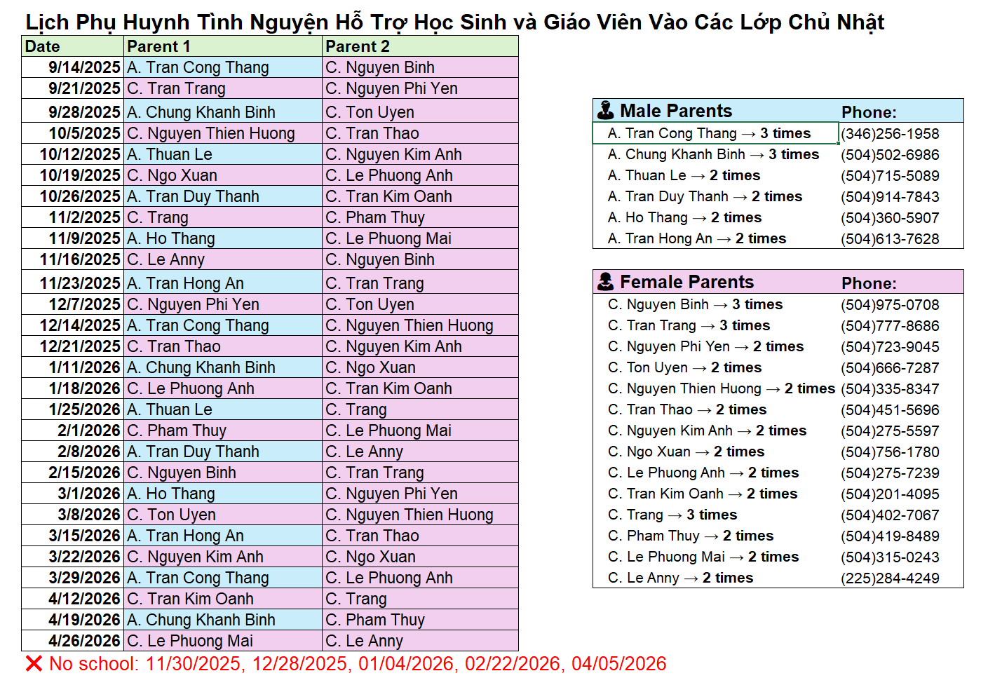 Chúng tôi sẽ cố gắng liên lạc nhắc nhở mỗi phụ huynh được phân công trước mỗi tuần.