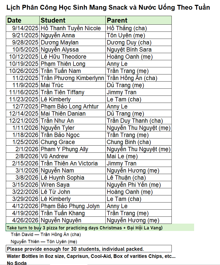 - Lịch phân công theo tên học sinh để biết phụ huynh nào được giao chuẩn bị đồ ăn nhẹ/đồ uống cho lớp.